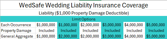 Refer to this chart to review WedSafe liability insurance coverage limit options. If you have questions, call 1-877-723-3933, Monday through Friday, from 9:00 a.m. – 8:00 p.m. ET, to speak to a Client Relationship Specialist.